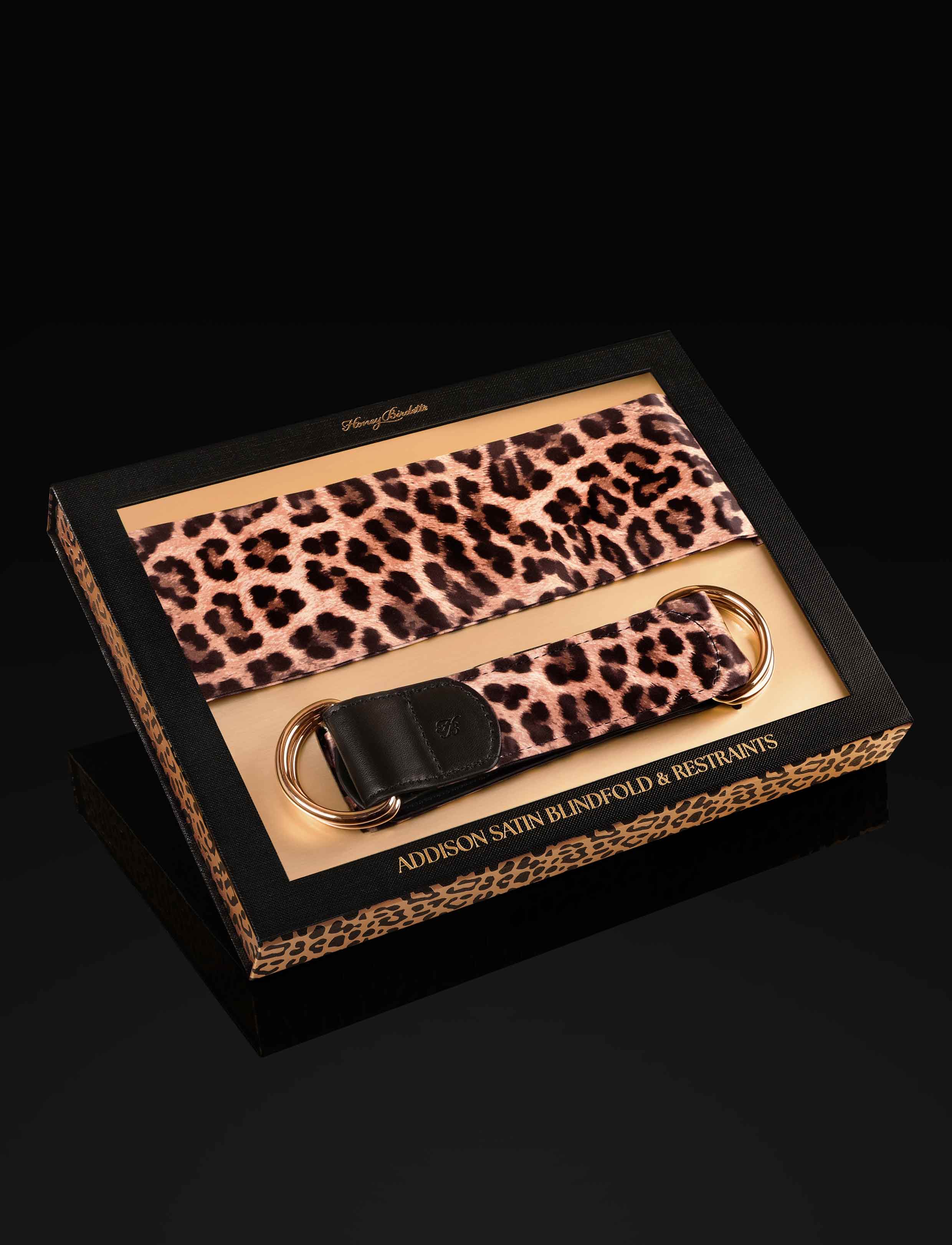 Dare to tame a lover with these leopard print restraints. Designed for bedroom play and bondage play, this multi-use set comes with a leopard print blindfold and matching satin ties. Create body straps and binds, or use them as cuffs for wrists, ankles, and thighs. Ready to test the limits? We know you are, honey…